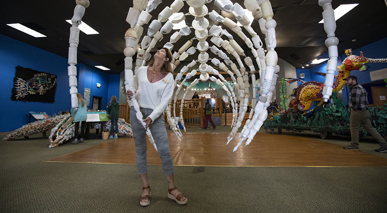 Large sculptures sound the alarm about plastic pollution littering ocean beaches